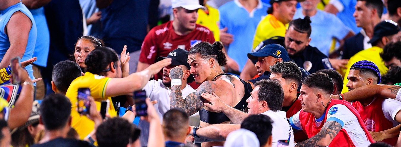 Un bochornoso espectáculo ocurrió tras el final del duelo entre Colombia y Uruguay por el pase a la final de la Copa América 2024.Registrándose el escándalo en las gradas del estadio Bank of America Stadium, las imágenes de televisión mostraron como los fanáticos se peleaban e incluso jugadores interveníanen el conflicto.